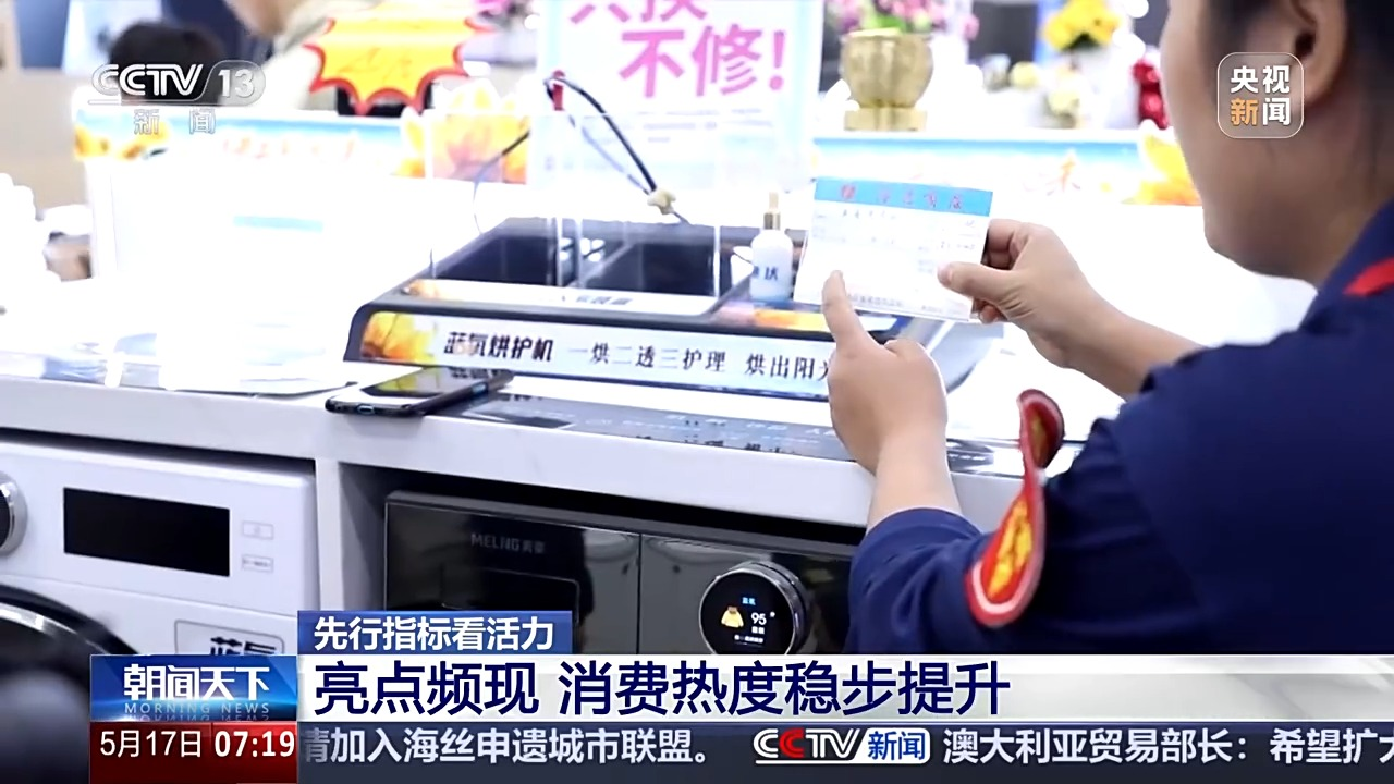 中国宏观经济研究院研究员 刘方:各地各部门都在因地制宜加快培育和发展新质生产力。与此同时,我国不断完善了以法律法规、财税政策、金融政策和创新政策为主体的创新政策体系,经营主体更加敢创、敢干、敢投,初创类和创新型企业的活力得到了加速释放。 亮点频现 消费热度稳步提升 接下来看消费。4月份,我国消费市场延续了一季度以来的回暖向好态势,多领域亮点频现,呈现稳步向好势头。 随着消费品以旧换新政策加力扩围,政策红利加速释放,国家信息中心监测主要家电品类网络零售数据显示,4月相关家电网络零售额同比上升13.2%,绿色化、智能化消费趋势愈加明显。