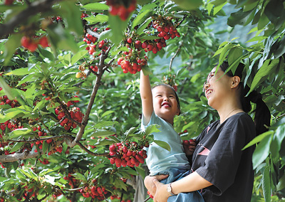 在河北石家庄的采摘园里,游客采摘樱桃。 张晓峰摄(影像中国)