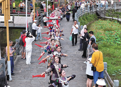 在湖南怀化的景区里,游客观看民族服饰表演。 李尚引摄(人民视觉) 赏景、购物、观影,各地活动丰富多彩 “五一”假期,各地消费市场持续升温,消费活力持续释放,折射中国经济回升向好态势。 踏青赏景、出行远游……“五一”假期,文旅消费需求集中释放。各地区各部门推动旅游与文化、体育等加速融合,推出个性化、多样化、品质化的产品和服务,激发文旅市场发展活力。 各地商圈特色消费活动丰富多彩。4月30日晚,江苏苏州高新区狮山文化广场上灯火璀璨、人头攒动,“狮山市集”系列活动在这里启动,50余家博物馆、文博机构齐聚,带来1000多款文创产品和国风好物,让市民与游客沉浸式感受各地文化,“一站式”购买热销海内外的文博文创产品。 5月1日,2025年湖南省乡村文化旅游节茶陵分会场活动在茶陵县花湖谷景区启动。活动集避暑休闲、森林康养、生态观光、民俗互动、美食品鉴于一体。5月1日至2日,景区客流累计超7.6万人次,带动门票、餐饮、民宿及农副产品销售全面提升。 4月30日晚,江西芦溪县古城广场热闹喜庆。电影《哪吒之魔童闹海》中的“角色”穿梭在活动现场。正在游玩的肖女士说:“孩子特别喜欢哪吒,今天能近距离接触特别开心,感觉走进了神话世界。”据网络平台统计,截至5月2日13时38分,“五一”档电影新片(含重映)总票房(含点映及预售)突破3亿元。 美团旅行数据显示,假期第一天,文旅消费持续升温,由异地游客贡献的景区门票交易额同比增长15%左右,上海迪士尼度假区、北京环球度假区、泰山风景名胜区、老君山风景名胜区、西安博物院等景区热度位居前列。 绿色家电、汽车畅销,政策效应释放 “五一”假期,各地区各部门完善消费政策,创新消费场景,改善消费条件,推动假日经济活力进一步迸发。 5月1日上午,江西萍乡市安源区十里花溪畔的赣湘边奥莱数字生活城开业。当地居民李敏和女儿挤进商场。憨态可掬的机器人巡游方阵正踏着音乐节拍行进,孩子高兴地随着音乐蹦跳。消费者在商场购物,还可在美食区享用美味。开业首日,奥莱数字生活城客流量突破5万人次,带动周边商户单日营收最高增长15倍。 政策带动,绿色家电销售火爆。快手电商数据显示,“五一”假期前两日,各类绿色节能产品畅销,其中空调、冰箱、洗地机、蒸汽清洁机等销售均有大幅提升。 抢抓“五一”消费旺季,多地发布政策加快推动消费品以旧换新。上海进一步加力支持汽车置换更新,补贴范围扩大至外牌旧车,不少汽车门店迎来大量客流。宁夏将在“五一”期间举办24场以旧换新主题活动,“五一”假期消费品以旧换新补贴资金将不少于4000万元。 户外运动等新型消费热度颇高。摩托艇轰鸣破浪,拖拽飞人凌空翱翔,皮划艇悠然划行……“五一”假期,在四川成都金堂县的淮州国际山水运动中心,大量游客和市民慕名而来。“网上刷到这里的水上项目就立刻订票了,果然没让人失望!”刚体验完摩托艇项目的李先生满脸兴奋地说。 景区开放时间延长,提升游客满意度 交通、住宿、餐饮、购物,各地区各部门积极做好假期消费市场保障工作,让群众买得安心、吃得放心、玩得开心。 “景区边上就有充电桩,还能在手机上预约,省去了排队等待时间,充电速度也快,真不错!”5月1日,上海市民张伟强自驾到浙江金华浦江县郑家坞镇游玩,使用景区快充充电桩,仅用20分钟便将新能源汽车充满电。为保障游客安心出行,“五一”假期,当地加强景区充电站运维力度,增加巡检频次。 “五一”假期,江苏省文化和旅游厅聚焦游客关切提升服务质量,有针对性地及时发布提醒提示,引导游客错峰出行、安全出游。鼓励热门景区和文博场馆延长开放时间,优化预约机制、入园措施和游览线路,设置投诉接待点,提供现场投诉服务,及时回应游客诉求和纾解游客情绪,进一步提升游客满意度。 5月2日上午,四川广安邻水县银鼎山广场,以旧换新活动火热举行。针对节日消费高峰,邻水县整合市场监管、商务、文广旅等部门力量,聚焦民生消费领域,多举措打击违法行为、规范市场秩序,优化消费环境。 | ||||
